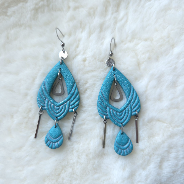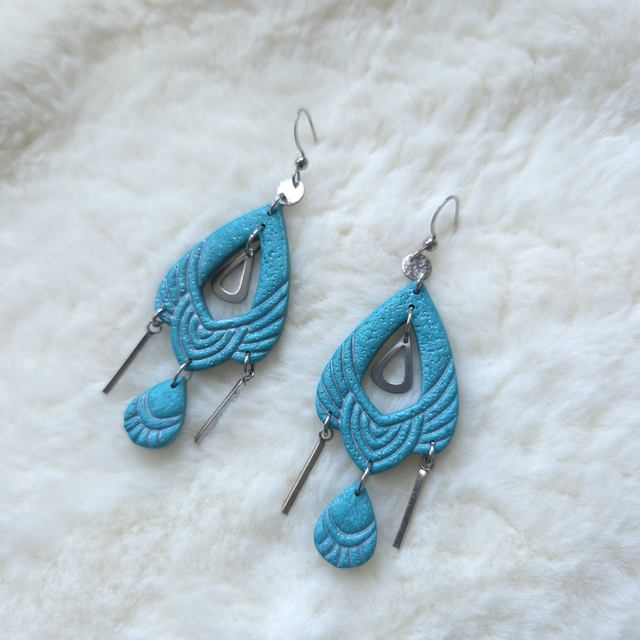 Les boucles d’oreilles Capucine sont un modèle unique, entièrement fait main en argile polymère. Leur forme goutte sculptée dans un turquoise vibrant, rehaussée de motifs argentés, crée un style bohème-chic lumineux. Deux fines pampilles métalliques et un pendant assorti animent la pièce pour un mouvement élégant.