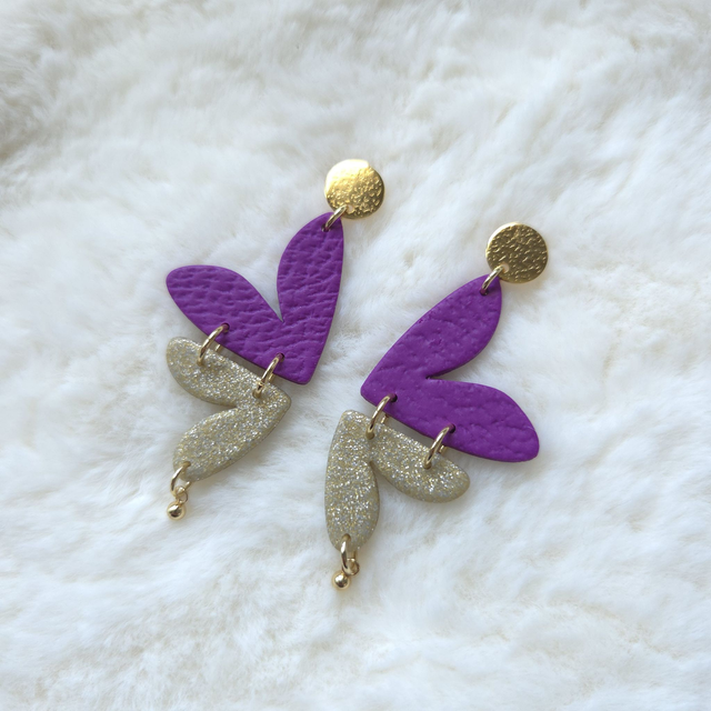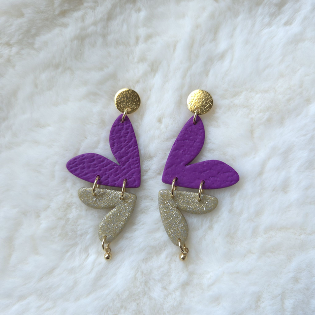Les boucles d’oreilles Jaïa apportent une touche vibrante et élégante à n’importe quelle tenue. Leur design inspiré de pétales stylisés mélange un violet texturé éclatant à un or pailleté lumineux. L’ensemble est entièrement façonné à la main en polymère, ce qui les rend ultra légères et agréables à porter toute la journée.