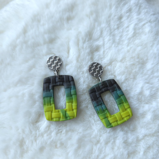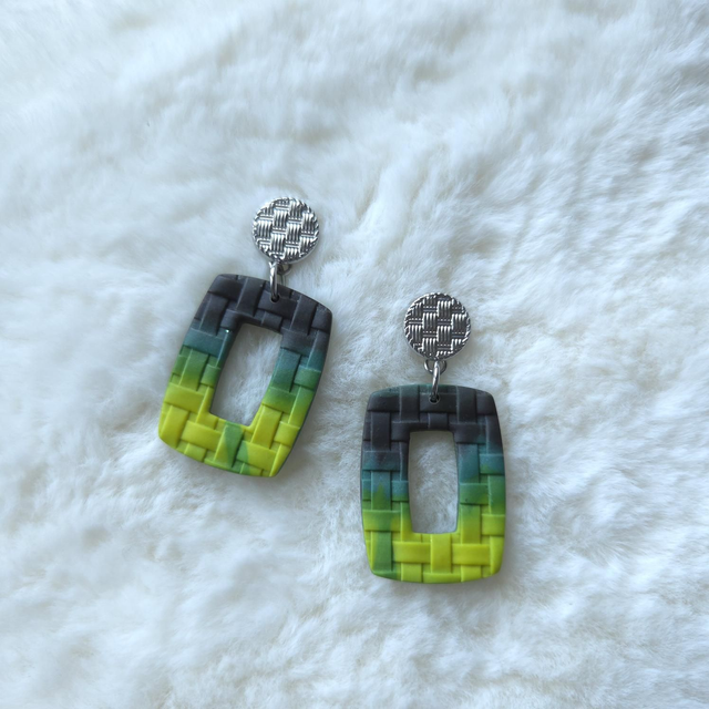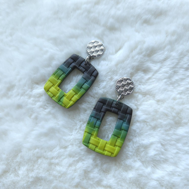 Les boucles d’oreilles Oriane se distinguent par leur dégradé unique de vert et de noir, travaillé minutieusement en effet tissé pour créer une surface graphique et moderne.