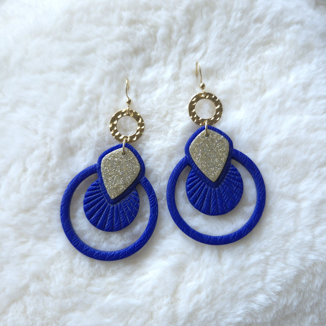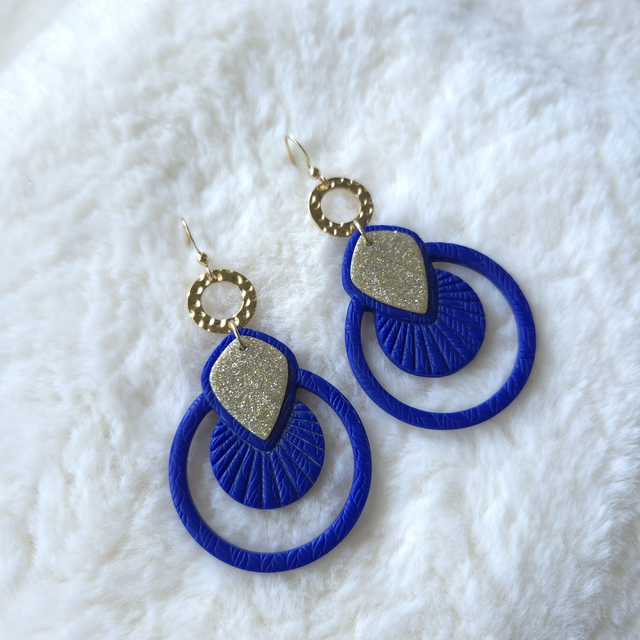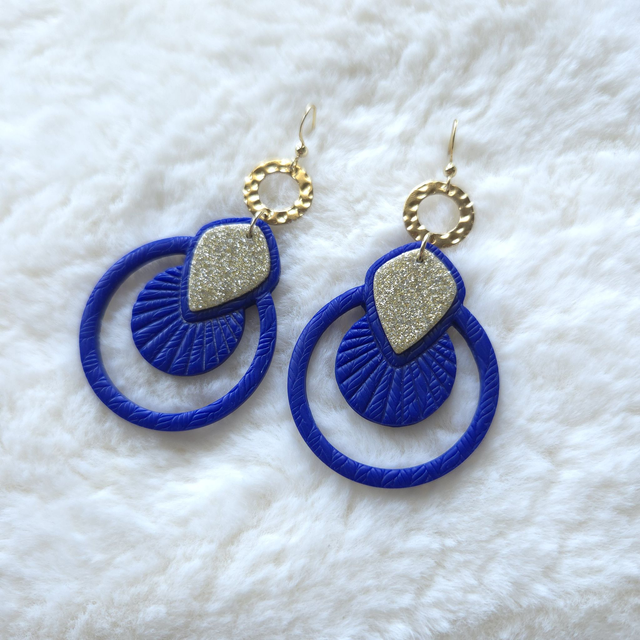 Un modèle lumineux et affirmé, mêlant un bleu intense à un éclat doré pailleté. Réalisées en argile polymère avec apprêts en acier inoxydable, elles offrent légèreté et tenue.