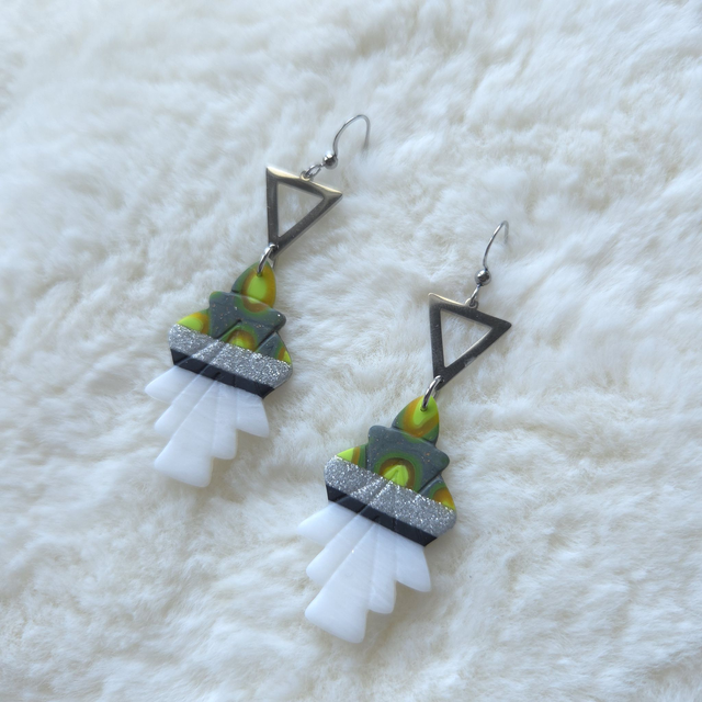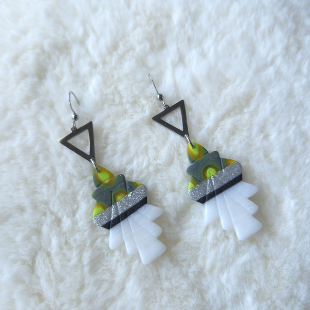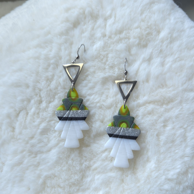 Solen est une paire de boucles d’oreilles minimalistes et graphiques en argile polymère, façonnées à la main dans un jeu élégant de noir, blanc et touches de vert. Leur silhouette élancée de 7,5 cm crée un contraste moderne et lumineux, parfait pour un style affirmé mais subtil.